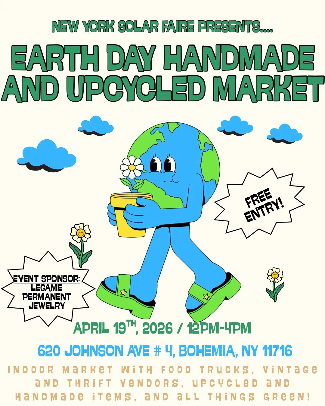 Earth Day Handmade and Upcycled Market Sunday, April 19, 2026 12:00 PM 4:00 PM NY Solar Faire 620 Johnson Ave #4 Bohemia, New York United States (map) Google Calendar ICS